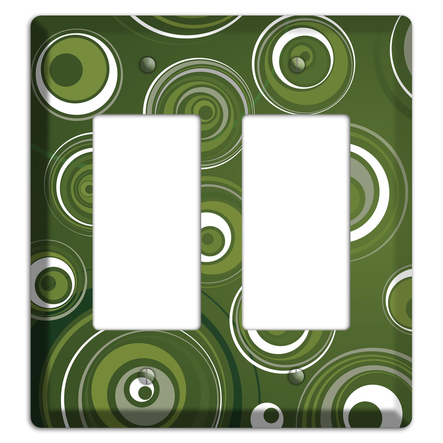 The Green Circles Cover Plates 2 Rocker Wallplate are very unique and cannot be found anywhere else. These USA made metal plates are highly detailed and made with some of the newest UV imaging technology available resulting in photograph quality prints on durable metal switchplates.