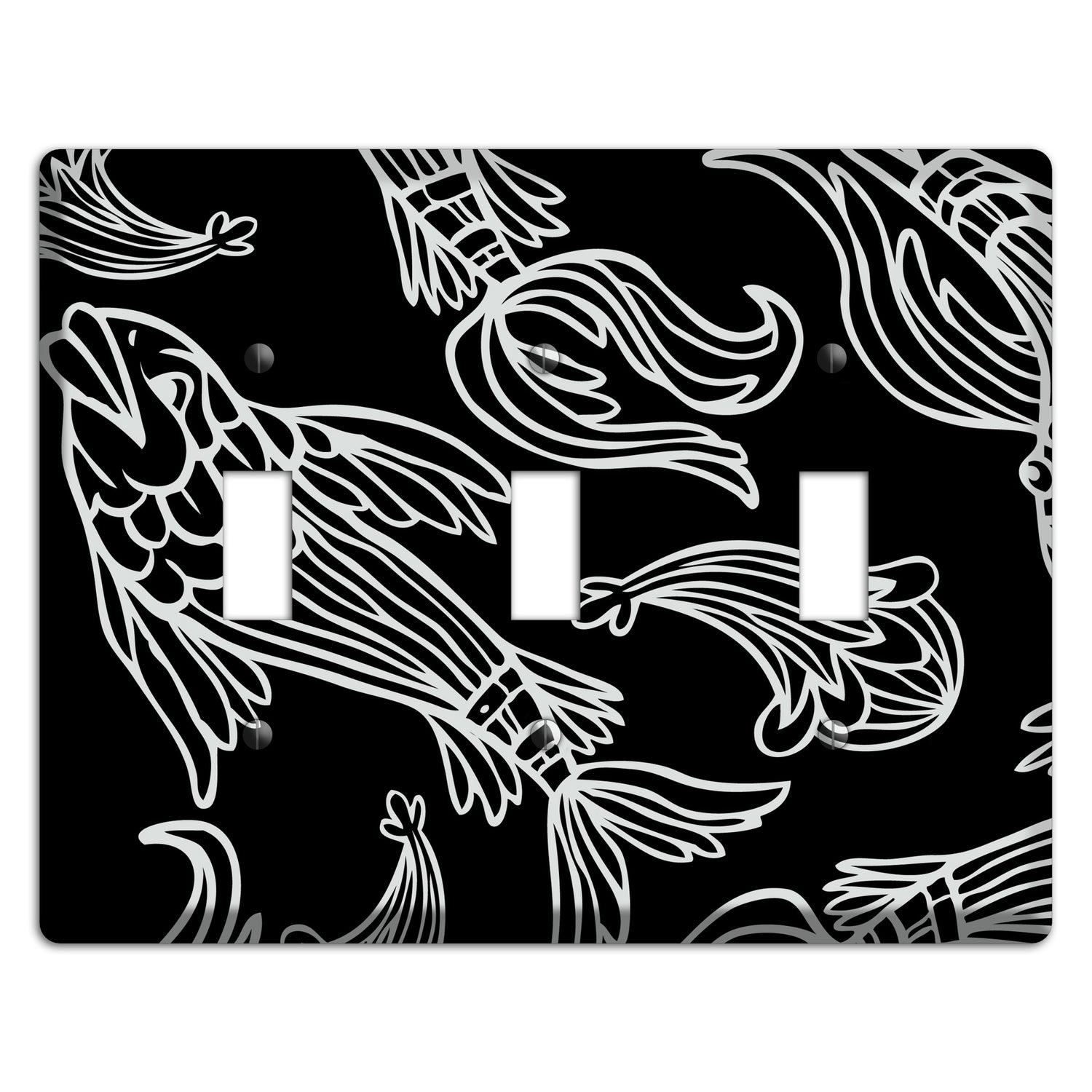 The Black and White Koi Cover Plates 3 Toggle Wallplate are very unique and cannot be found anywhere else. These USA made metal plates are highly detailed and made with some of the newest UV imaging technology available resulting in photograph quality prints on durable metal switchplates.