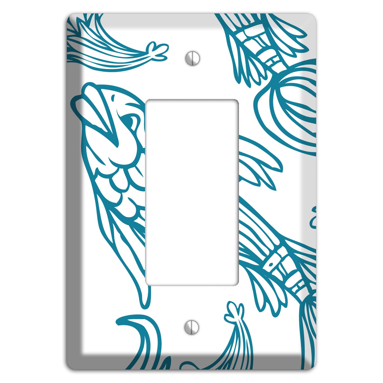 The Teal and White Koi Cover Plates Rocker Wallplate are very unique and cannot be found anywhere else. These USA made metal plates are highly detailed and made with some of the newest UV imaging technology available resulting in photograph quality prints on durable metal switchplates.
