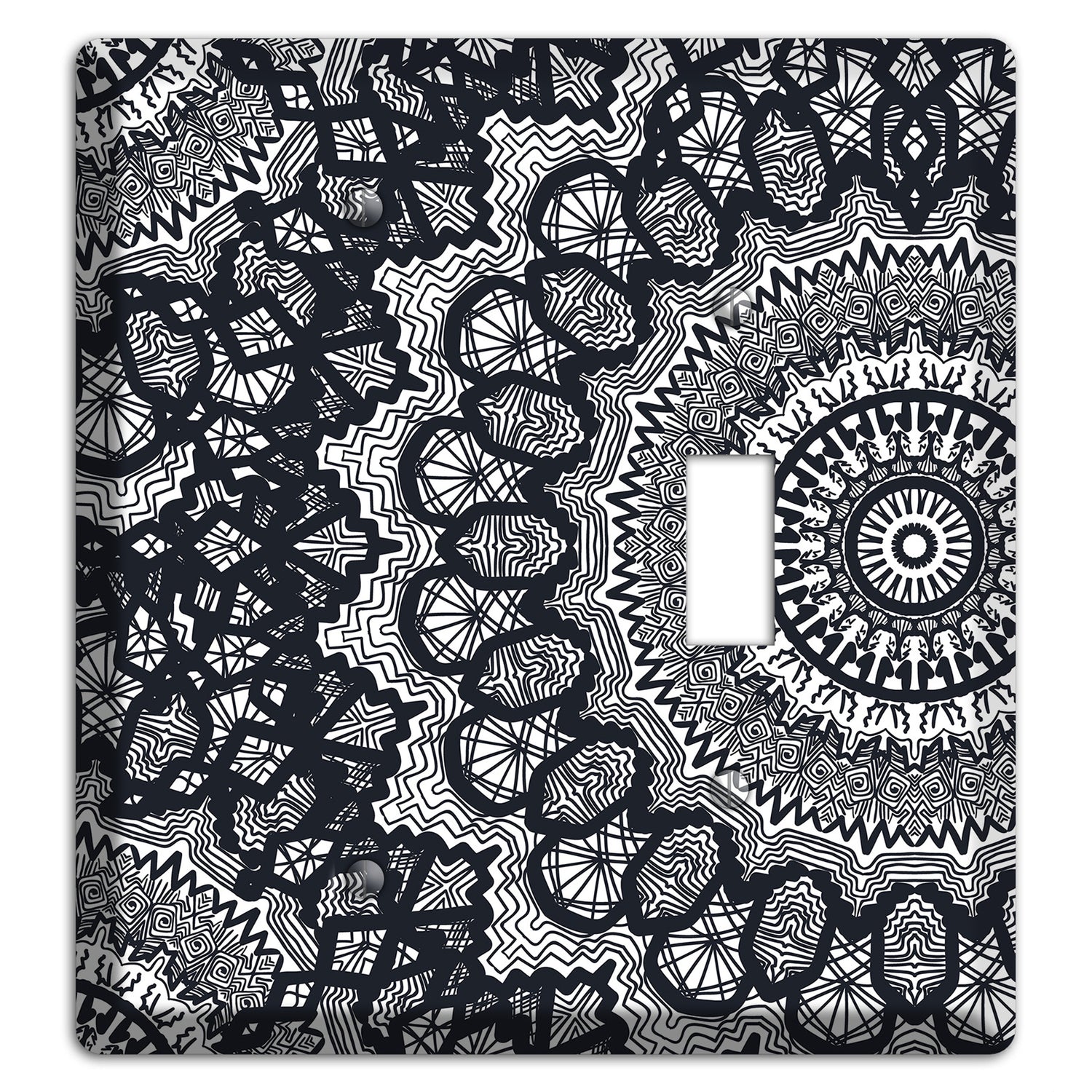 The Mandala Black and White Style T Cover Plates Blank / Toggle Wallplate are very unique and cannot be found anywhere else. These USA made metal plates are highly detailed and made with some of the newest UV imaging technology available resulting in photograph quality prints on durable metal switchplates.