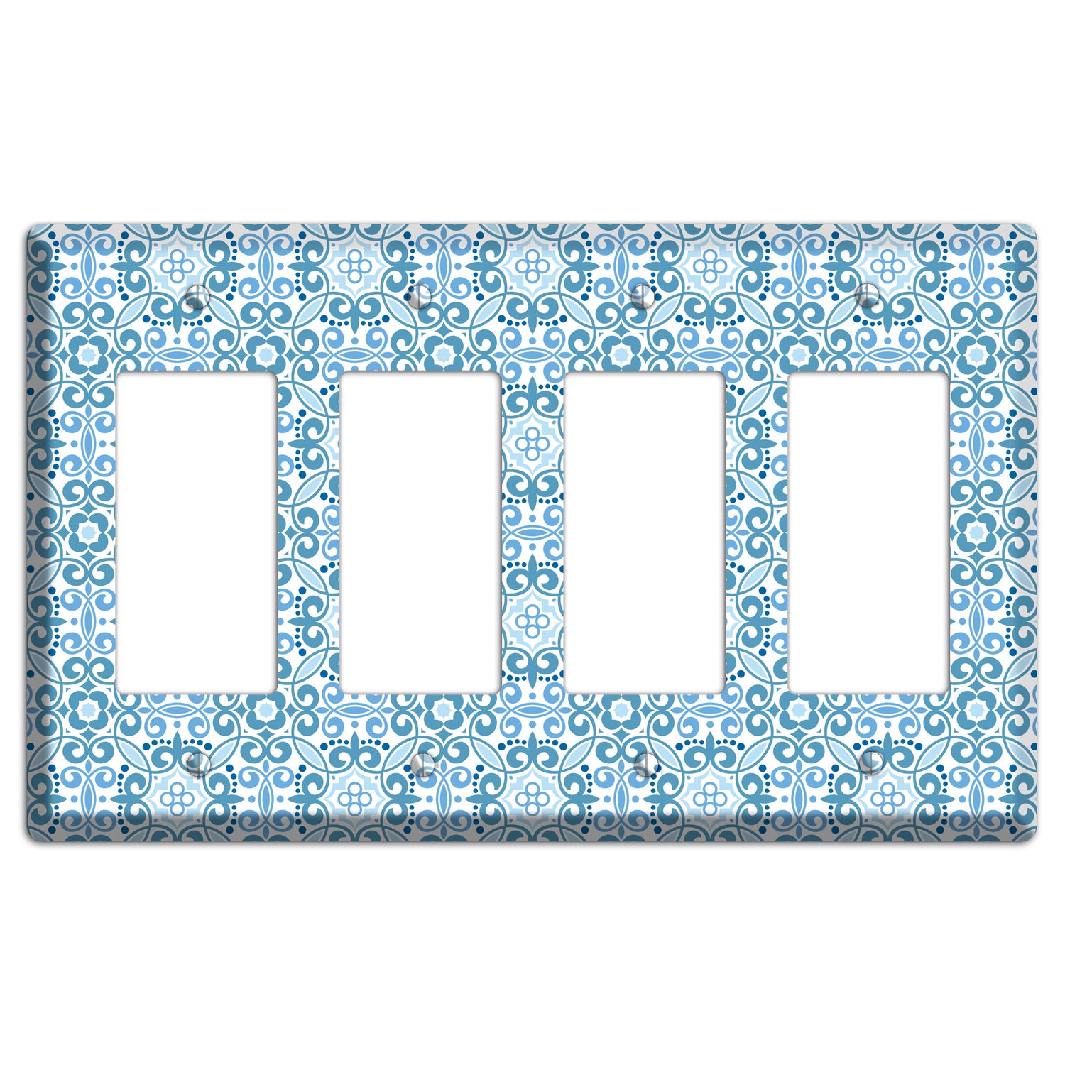 The Multi Blue Foulard 4 Rocker Wallplate are very unique and cannot be found anywhere else. These USA made metal plates are highly detailed and made with some of the newest UV imaging technology available resulting in photograph quality prints on durable metal switchplates.