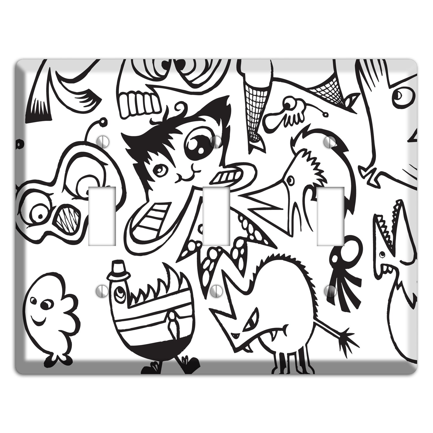 The Black and White Whimsical Faces 3 Cover Plates 3 Toggle Wallplate are very unique and cannot be found anywhere else. These USA made metal plates are highly detailed and made with some of the newest UV imaging technology available resulting in photograph quality prints on durable metal switchplates.