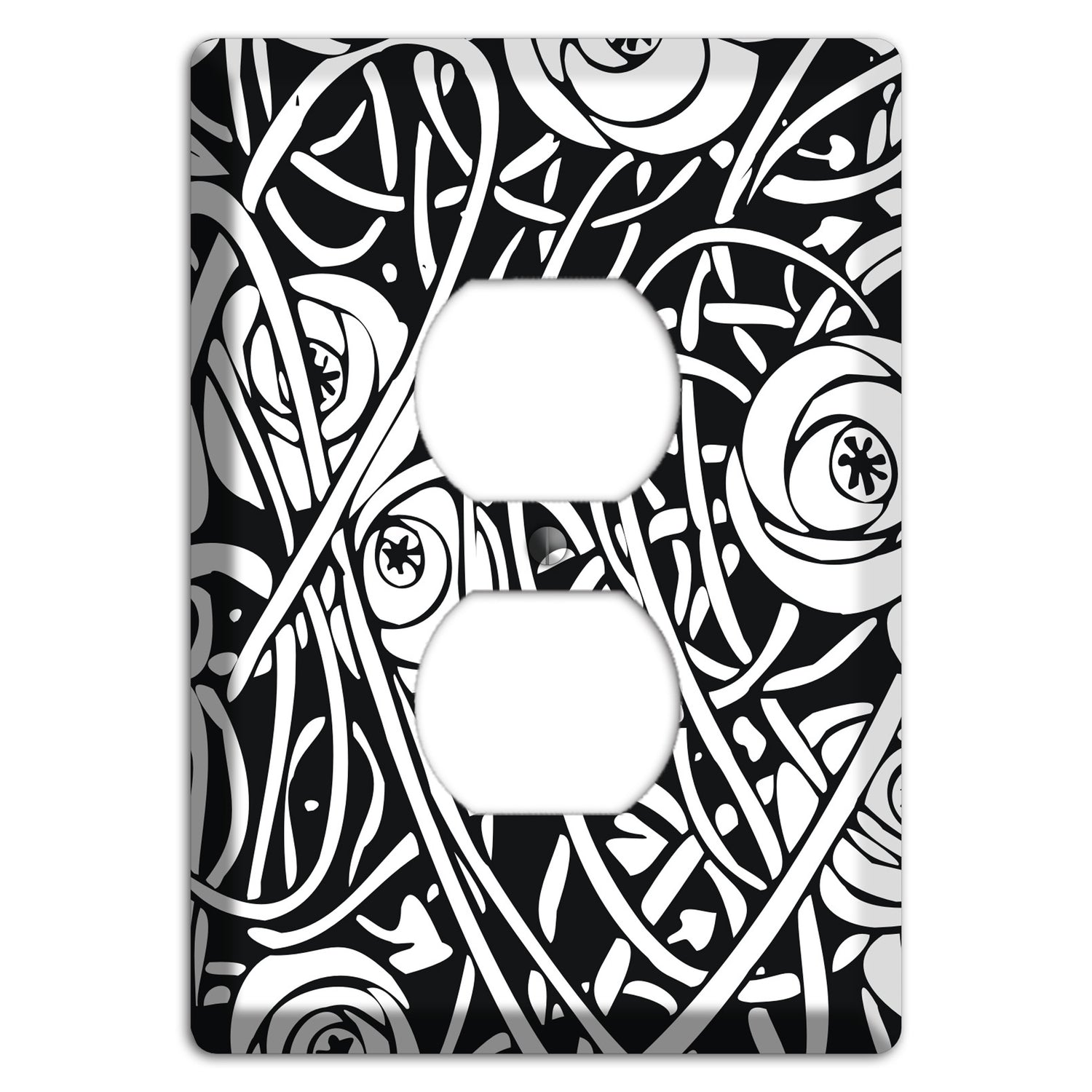 The Black and White Deco Floral Cover Plates Duplex Outlet Wallplate are very unique and cannot be found anywhere else. These USA made metal plates are highly detailed and made with some of the newest UV imaging technology available resulting in photograph quality prints on durable metal switchplates.