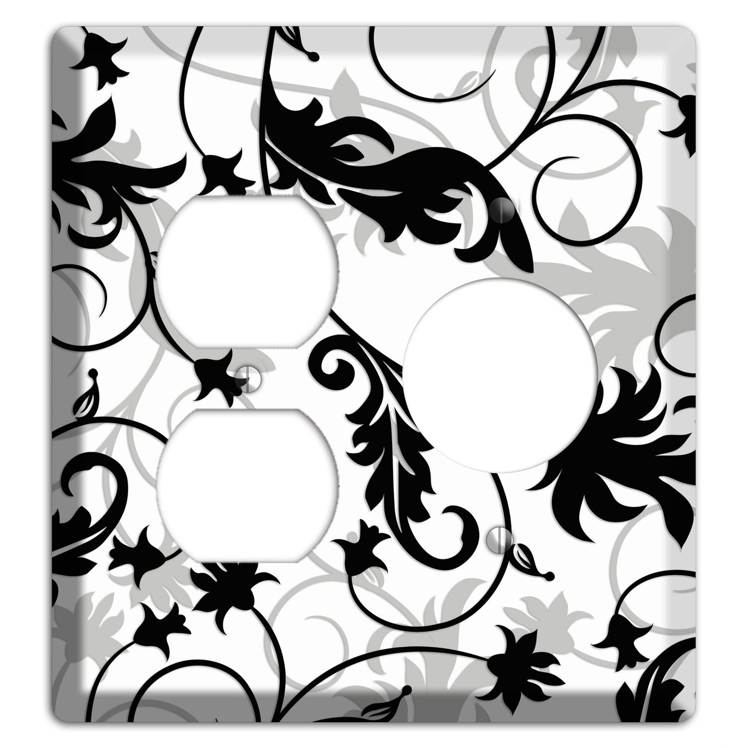 The Black White and Grey Victorian Sprig Duplex / Receptacle Wallplate are very unique and cannot be found anywhere else. These USA made metal plates are highly detailed and made with some of the newest UV imaging technology available resulting in photograph quality prints on durable metal switchplates.