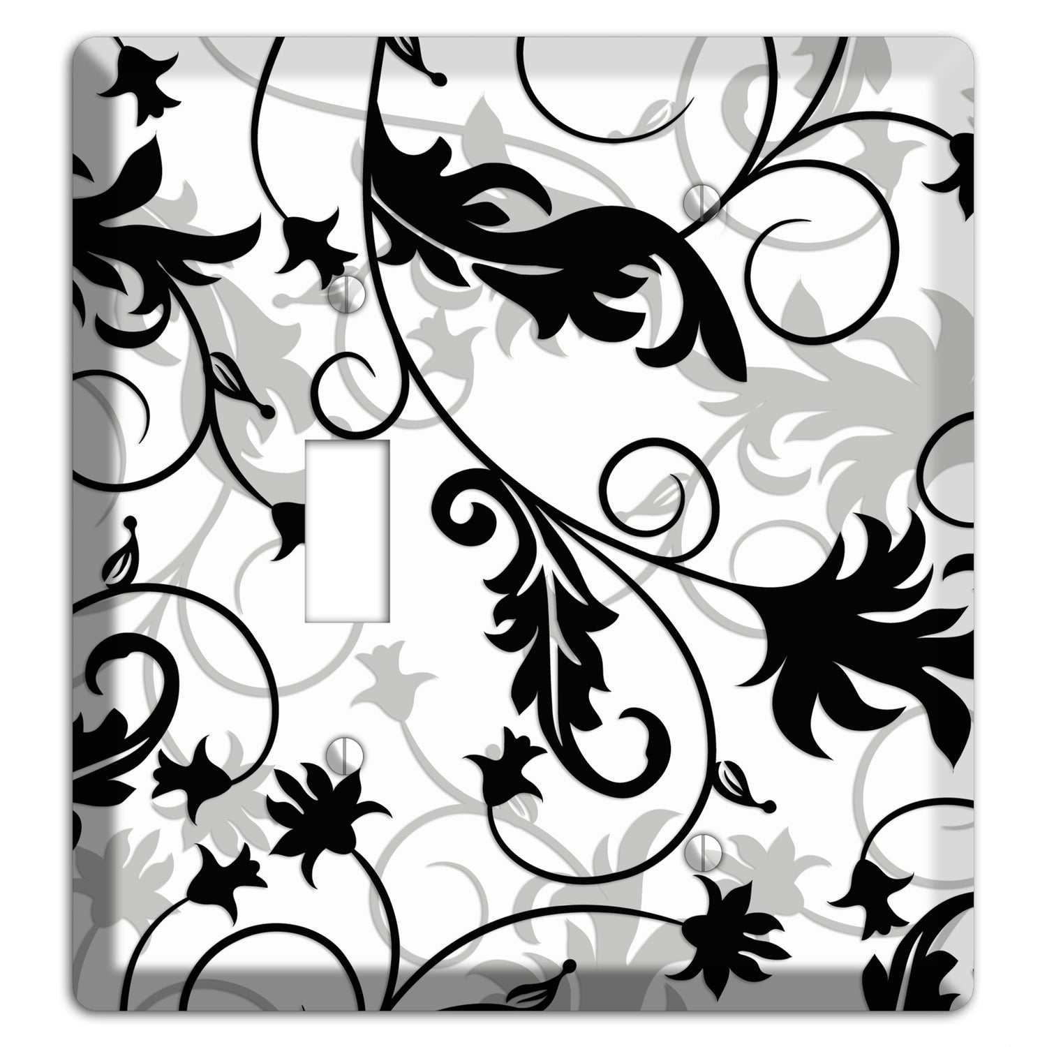 The Black White and Grey Victorian Sprig Toggle / Blank Wallplate are very unique and cannot be found anywhere else. These USA made metal plates are highly detailed and made with some of the newest UV imaging technology available resulting in photograph quality prints on durable metal switchplates.