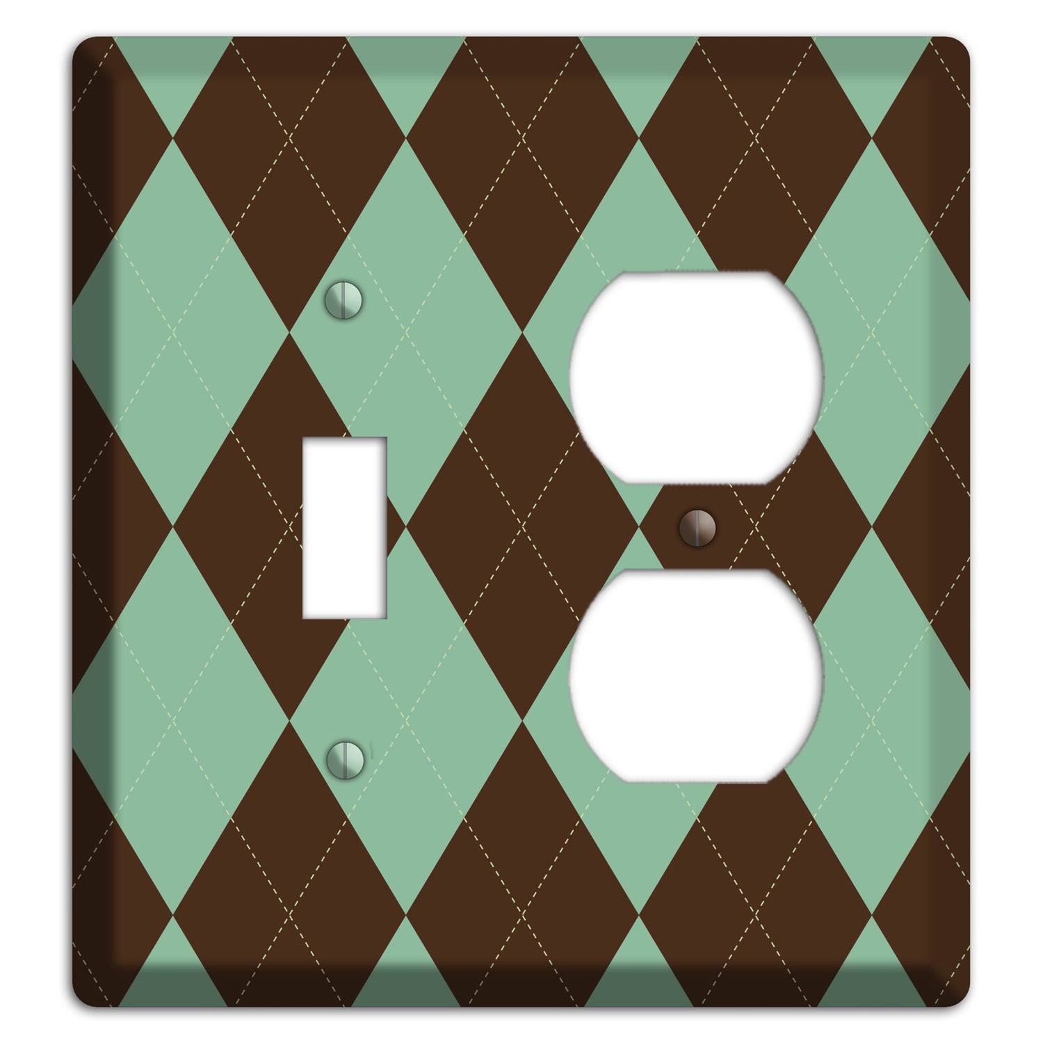 The Green and Brown Argyle Cover Plates Toggle / Duplex Wallplate are very unique and cannot be found anywhere else. These USA made metal plates are highly detailed and made with some of the newest UV imaging technology available resulting in photograph quality prints on durable metal switchplates.