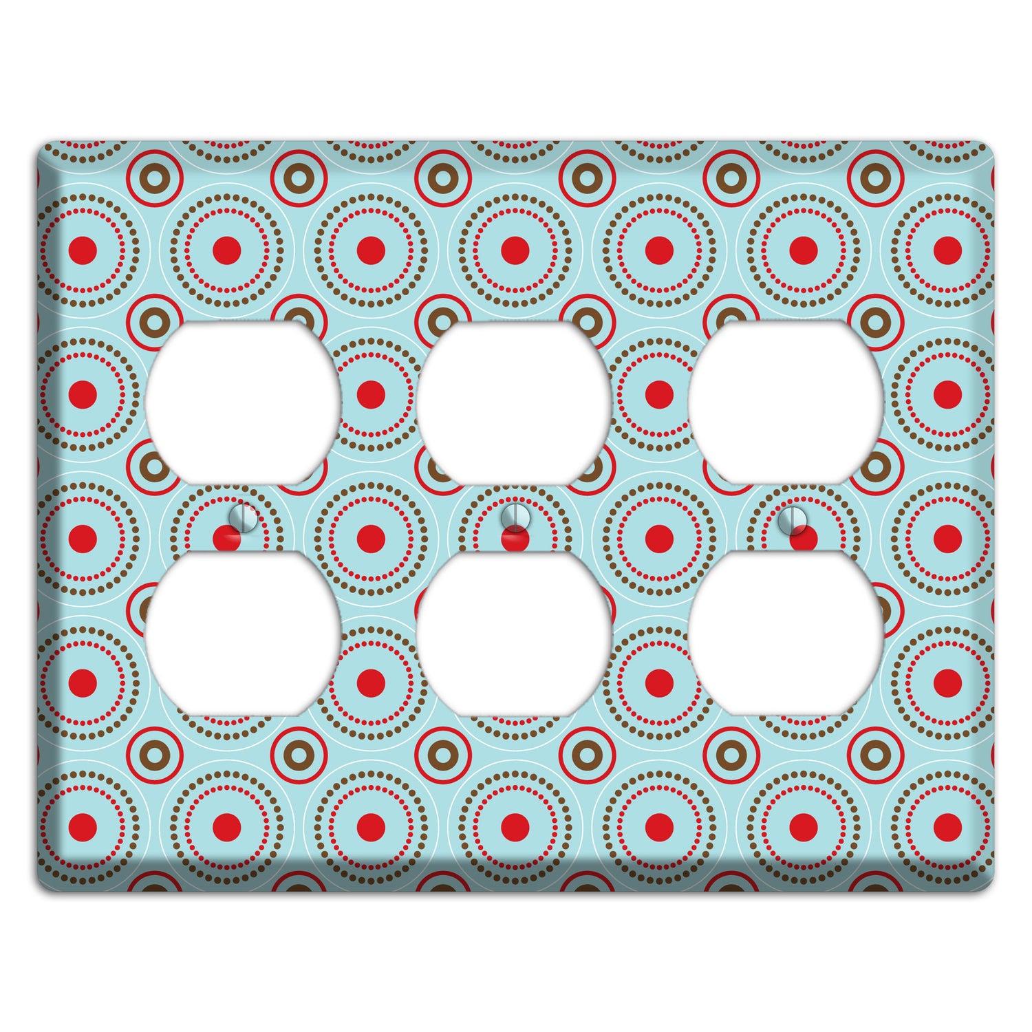 The Dusty Blue with Red and Brown Retro Suzani 3 Duplex Wallplate are very unique and cannot be found anywhere else. These USA made metal plates are highly detailed and made with some of the newest UV imaging technology available resulting in photograph quality prints on durable metal switchplates.