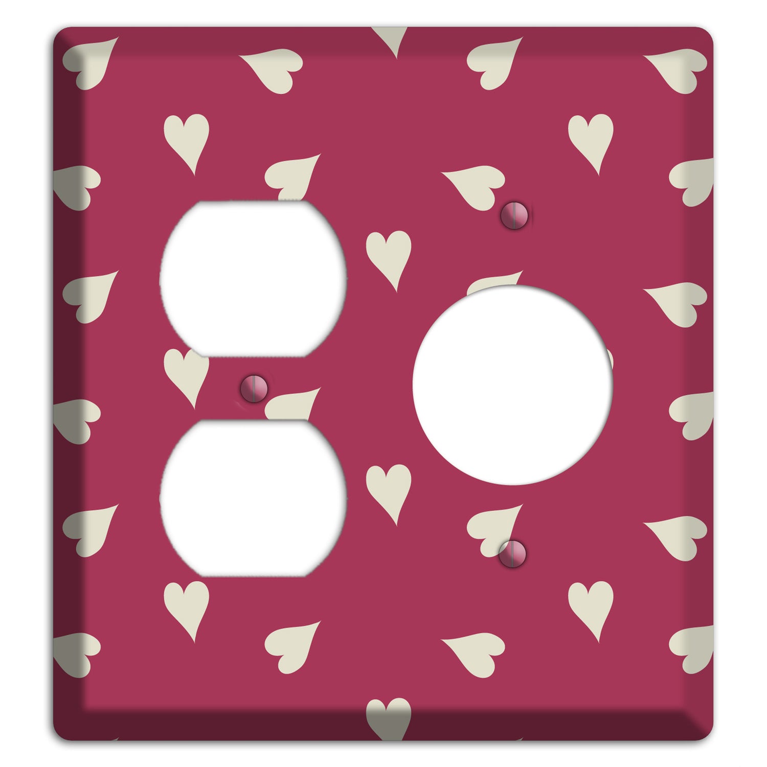 The Fuschia with White Hearts Duplex / Receptacle Wallplate are very unique and cannot be found anywhere else. These USA made metal plates are highly detailed and made with some of the newest UV imaging technology available resulting in photograph quality prints on durable metal switchplates.