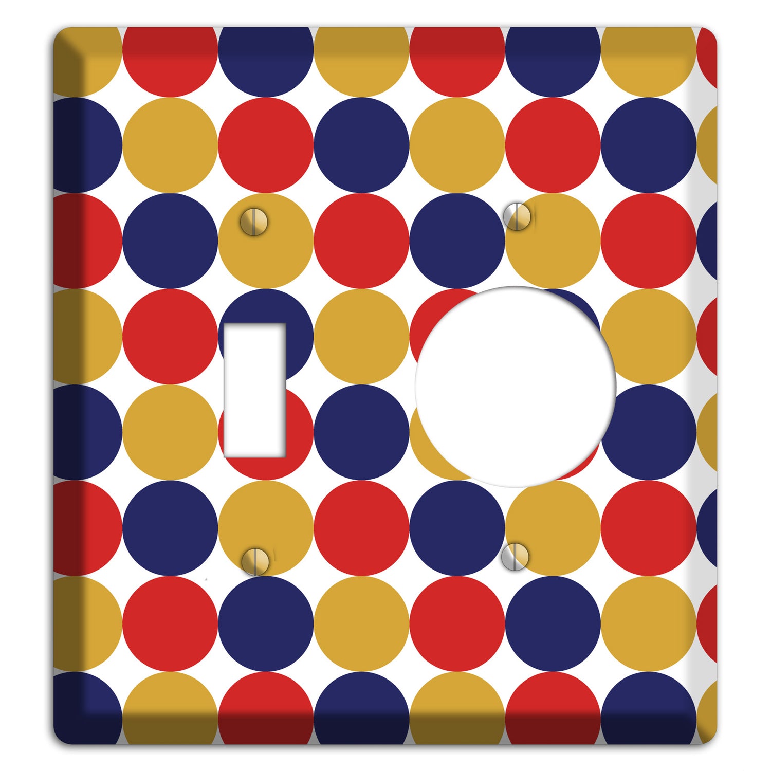 The Mustard Red Purple Tiled Dots Toggle / Receptacle Wallplate are very unique and cannot be found anywhere else. These USA made metal plates are highly detailed and made with some of the newest UV imaging technology available resulting in photograph quality prints on durable metal switchplates.