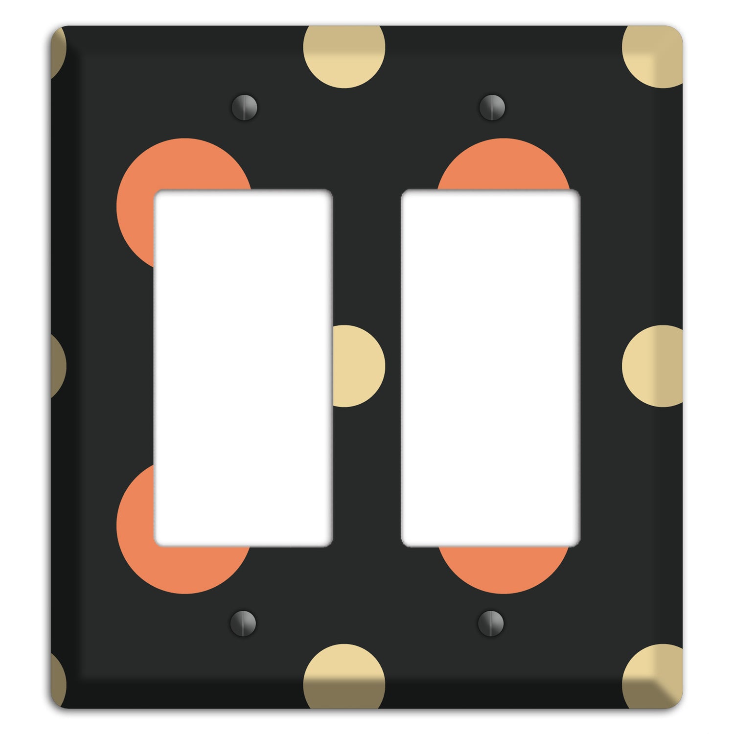 The Black with Coral and Beige Multi Medium Polka Dots 2 Rocker Wallplate are very unique and cannot be found anywhere else. These USA made metal plates are highly detailed and made with some of the newest UV imaging technology available resulting in photograph quality prints on durable metal switchplates.