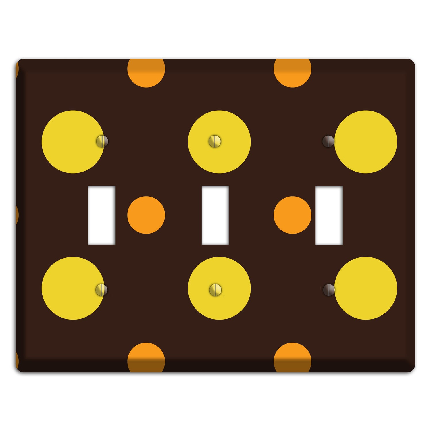 The Black with Yellow and Orange Multi Medium Polka Dots 3 Toggle Wallplate are very unique and cannot be found anywhere else. These USA made metal plates are highly detailed and made with some of the newest UV imaging technology available resulting in photograph quality prints on durable metal switchplates.