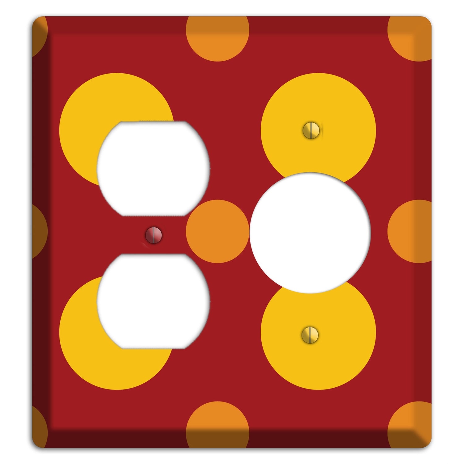 The Red with Multi Orange Multi Medium Polka Dots Duplex / Receptacle Wallplate are very unique and cannot be found anywhere else. These USA made metal plates are highly detailed and made with some of the newest UV imaging technology available resulting in photograph quality prints on durable metal switchplates.