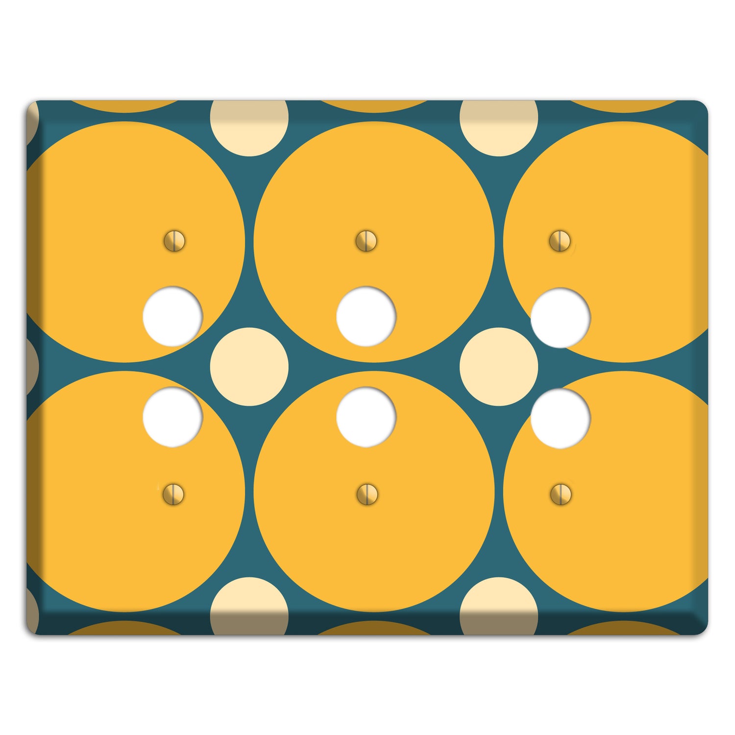 The Jade with Mustard and Beige Multi Tiled Large Dots 3 Pushbutton Wallplate are very unique and cannot be found anywhere else. These USA made metal plates are highly detailed and made with some of the newest UV imaging technology available resulting in photograph quality prints on durable metal switchplates.