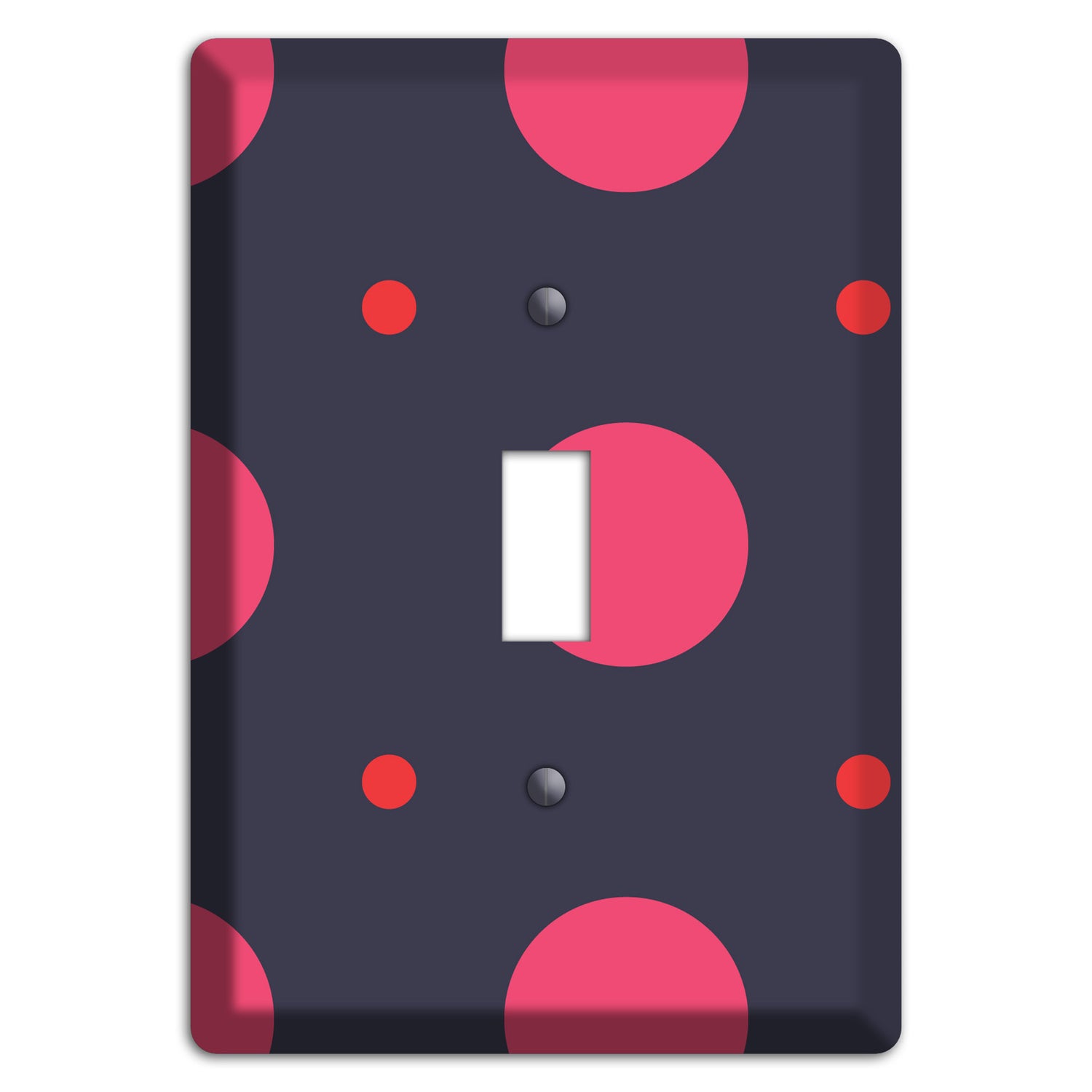The Dark Grey with Fuschia Multi Tiled Medium Dots Cover Plates are very unique and cannot be found anywhere else. These USA made metal plates are highly detailed and made with some of the newest UV imaging technology available resulting in photograph quality prints on durable metal switchplates.