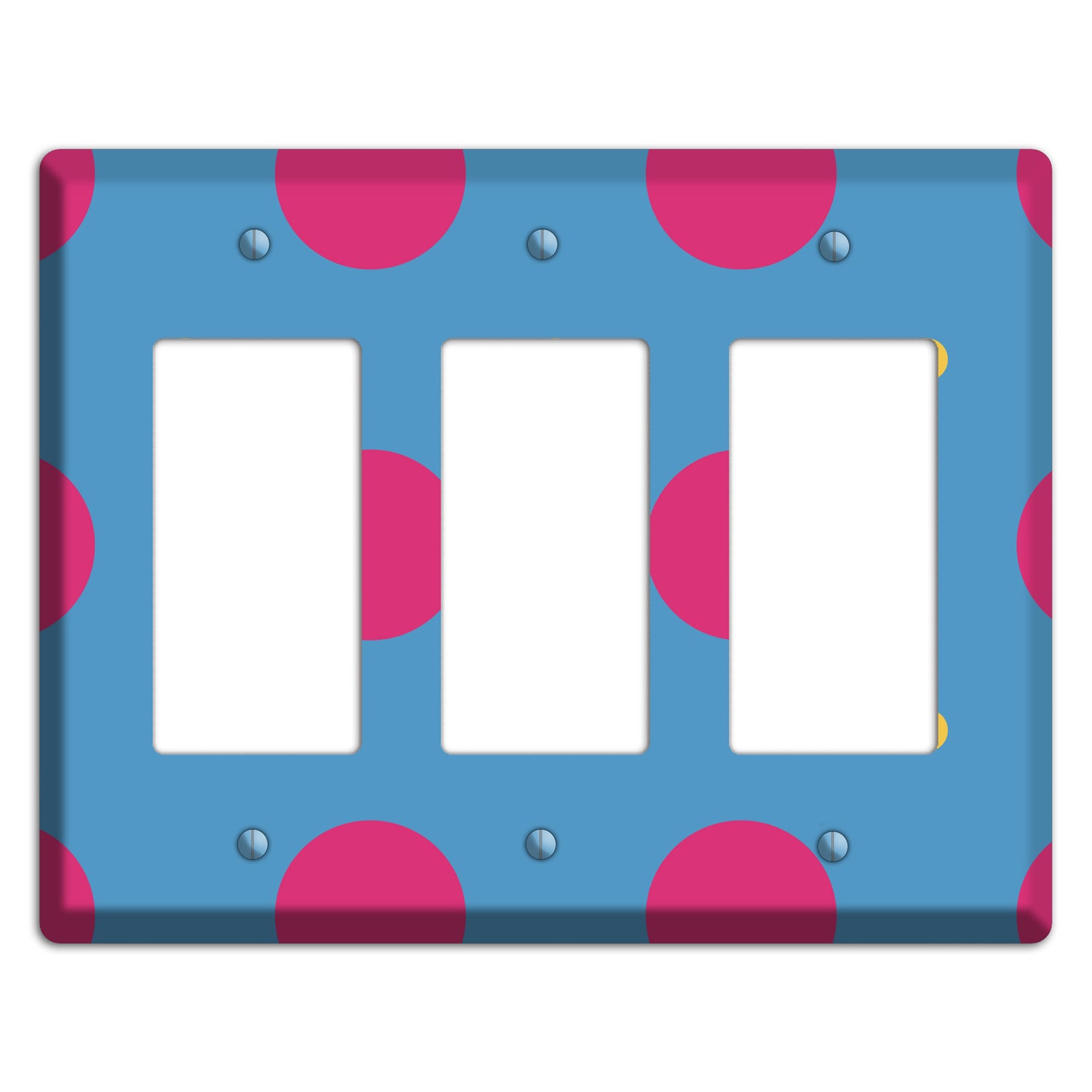 The Blue with Pink and Yellow Multi Tiled Medium Dots 3 Rocker Wallplate are very unique and cannot be found anywhere else. These USA made metal plates are highly detailed and made with some of the newest UV imaging technology available resulting in photograph quality prints on durable metal switchplates.