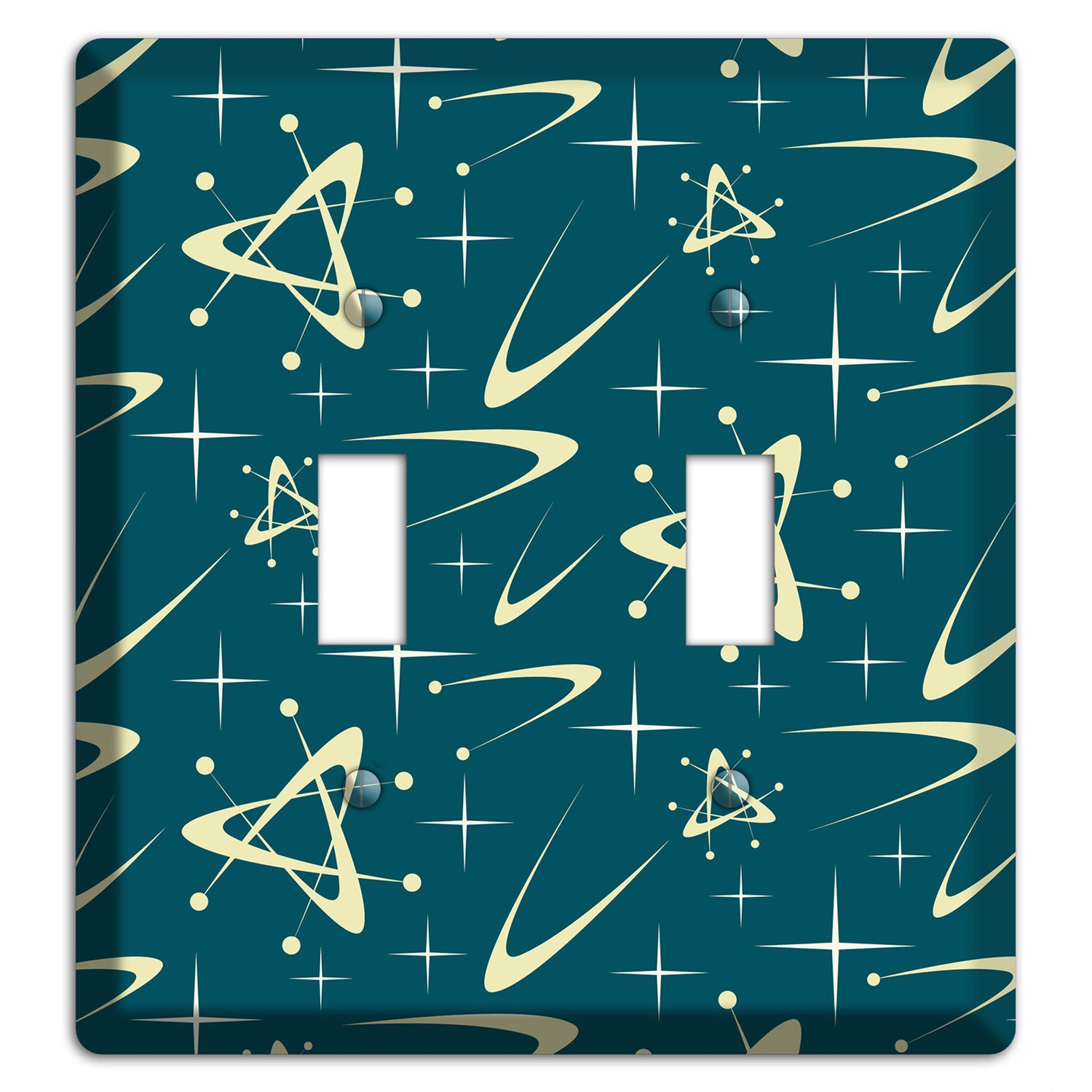 The Teal and Yellow Atomic 2 Toggle Wallplate are very unique and cannot be found anywhere else. These USA made metal plates are highly detailed and made with some of the newest UV imaging technology available resulting in photograph quality prints on durable metal switchplates.