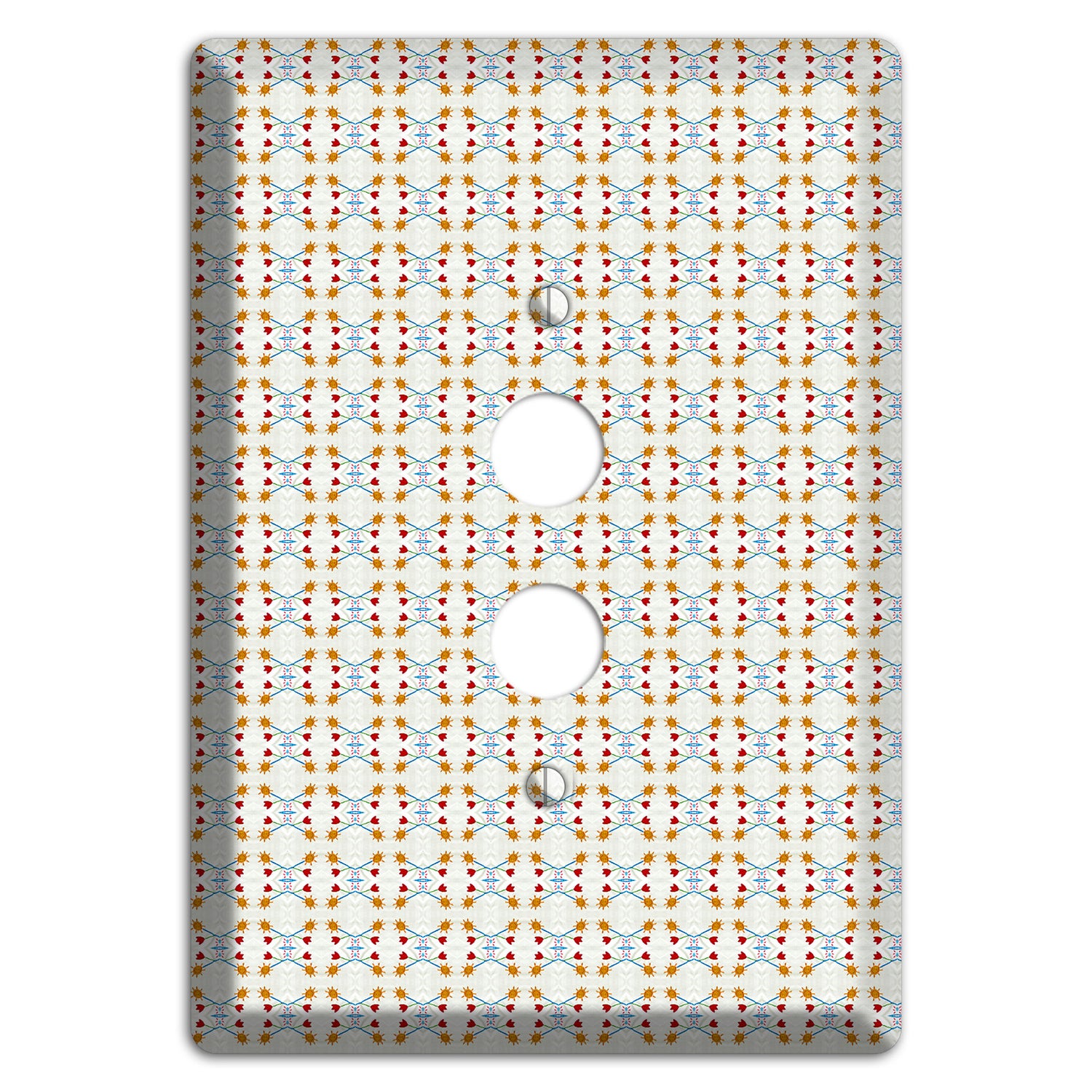 The Off White Red Blue Retro Arabesque 1 Pushbutton Wallplate are very unique and cannot be found anywhere else. These USA made metal plates are highly detailed and made with some of the newest UV imaging technology available resulting in photograph quality prints on durable metal switchplates.