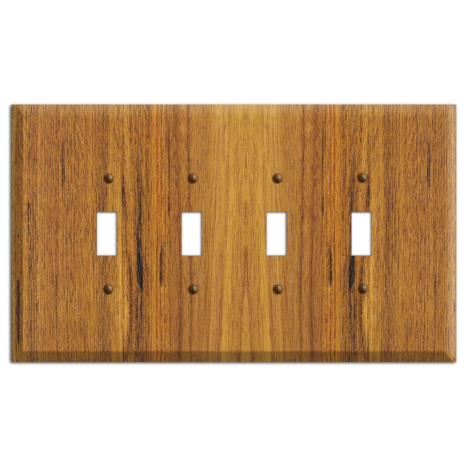 This item has been discontinued and is not returnable. It has been replaced with plates that can be found here: https://www.wallplates.com/collections/wood-wallplates The Teak Wood Four Toggle Switchplate is a USA made wallplate using eco friendly Teak Wood with a stainless steel backing. These plates have a hand rubbed oil finish to compliment the natural beauty of the wood.